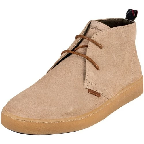 Les bottes en cuir Yuma de Barbour sont livrées avec une marque sur la languette, avec une tige en cuir, un confort haut de gamme et une fermeture à lacets. De couleur sable, ces bottes arborent une étiquette de marque sur le côté.