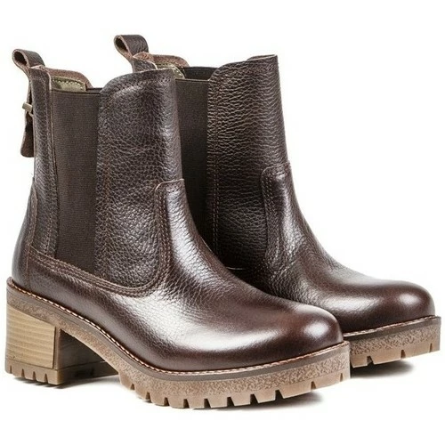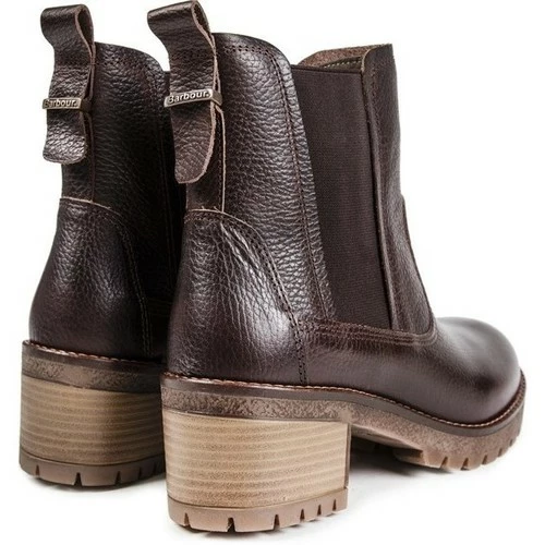 Bottines à enfiler brunes Barbour Kirk pour femmes avec tige en cuir texturé, goussets à double élastique et languette de talon de marque. Ces bottes à talons pour femmes ont une doublure en textile, une chaussette en cuir rembourrée et un talon bloc de 4 cm avec une semelle à crampons en caoutchouc de marque.