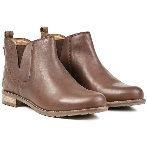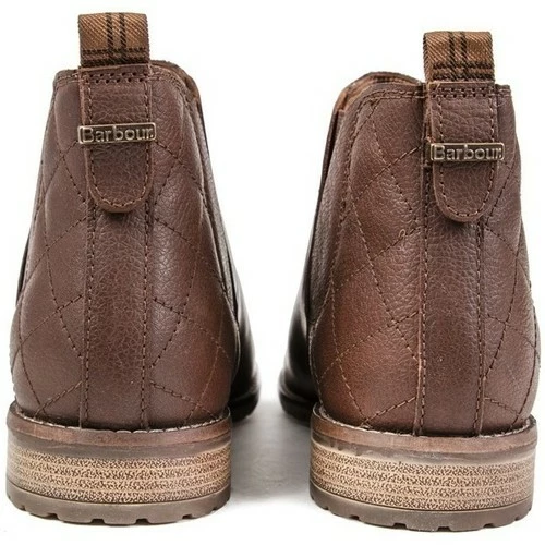 Bottines à enfiler Barbour Maia marron pour femme avec tige en cuir à double goussets élastiques, talon matelassé à effet piqué avec logo en métal et languette de talon en tartan. Ces bottes Chelsea à profil bas pour femmes ont une chaussette en cuir rembourrée, une doublure en textile et une semelle en caoutchouc de marque.